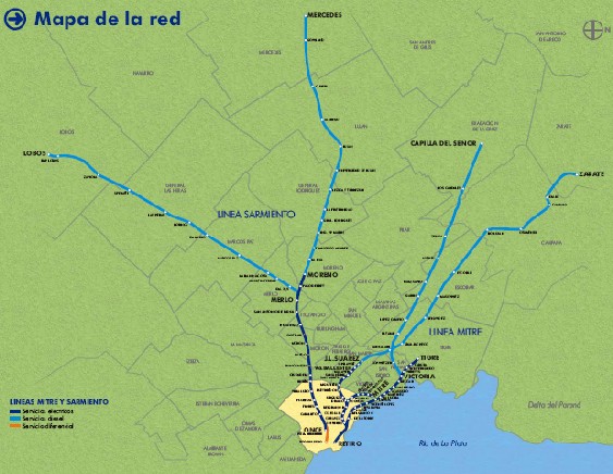HorariosLÍNEA MITRE:Retiro - Tigre: Retiro - J.L. Suárez/Bmé Mitre: Victoria - Capilla del Señor/Matheu: Villa Ballester - Zárate: LÍNEA SARMIENTO:Once/Plaza Miserere - Moreno: Once/Plaza Miserere - Moreno: Moreno – Luján/Mercedes: Merlo – Lobos/Las Heras: DIFERENCIAL PUERTO MADERO:Puerto Madero - Castelar: BUENOS AIRES - ROSARIO - SANTA FE:Recorre: Retiro - 3 de Febrero - Mtro. Carranza - Colegiales - Belgrano R - Drago - Urquiza - Pueyrredón - Miguelete - San Andrés - San Martín - Malaver - Villa Ballester - Chilavert - J.L. Suárez. Recorre: Retiro - L. de la Torre - Belgrano C - Núñez - Rivadavia - Vicente López - Olivos - La Lucila - Martinez - Acassuso - San Isidro - Beccar - Victoria - Virreyes - San Fernando - Carupá - Tigre. La línea Mitre se divide en seis líneas, 3 urbanas y 3 suburbanas: Urbanas:Recorre: Retiro - Zárate - Lima - Baradero - San Pedro - Ramallo - San Nicolás - Arroyo Seco - Groenwold - Rosario - G. Baigorria - San Lorenzo - B. de Irigoyen - San Eugenio - Santo Tomé - Santa Fe. Ver El diferencial de Puerto Madero está incorporado en la Línea Sarmiento. Recorre Puerto Madero - Castelar. Ver La línea Sarmiento consta de 3 líneas urbanas, incluyendo el diferencial de Puerto Madero y 4 suburbanas. Urbanas:Cada 60 minutos en hora pico. Recorre: Retiro - 3 de Febrero - Mtro. Carranza - Colegiales - Belgrano R - Coghlan - Saavedra - Juan B. Justo - Florida - Dr. Cetrángolo - Bmé. Mitre. Recorre: Plaza Miserere (Once) - Caballito - Flores - Floresta - Villa Luro - Liniers - Ciudadela - Ramos Mejía - Haedo - Morón - Castelar. La red ferroviaria de Buenos Aires, consta de dos líneas que abarcan la zona norte y la zona oeste de Capital Federal y municipios del Gran Buenos Aires, con un servicio diferencial a Puerto Madero. Además de una línea que une Buenos Aires con Rosario y Santa Fe. Mapa de la red ferroviaria (click en la imagen para ampliar)